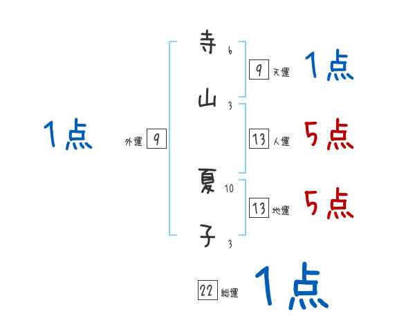 総運![]() | 寺山夏子さんの総運は22画の1つ星!努力することが苦手ないっぽう手先が器用。芸術性にも優れる。 あなたの人生を表す1番重要な運勢です。生涯を通じて影響する総合運となり、主に50歳以降の晩年期に影響を及ぼします。 |