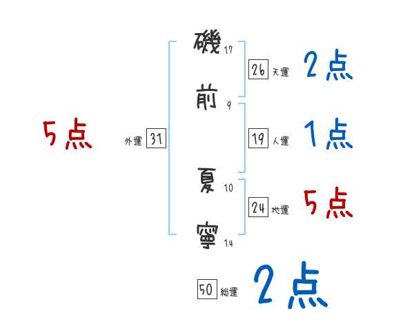 外運![]() | 磯前夏寧さんの外運は31画の5つ星!社交性があり判断力に優れる。順風満帆な人生で円満な生活。 生活面を象徴する運勢です。外部から受ける影響力を表し、結婚運、家庭運や職場、環境への順応性を表します。 |