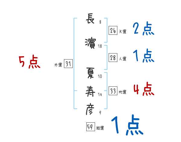 天運![]() | 長濵夏寿彦さんの天運は26画の2つ星!波瀾万丈かも。信頼できる人を大事にしましょう。 家系が持つ宿命的な運勢を表します。祖先から受け継いだ苗字ですので自分の力が及びません。家柄を象徴します。 |