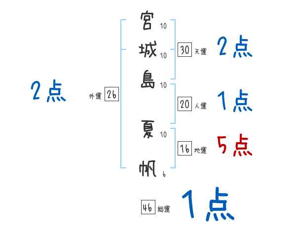 外運![]() | 宮城島夏帆さんの外運は26画の2つ星!波瀾万丈かも。信頼できる人を大事にしましょう。 生活面を象徴する運勢です。外部から受ける影響力を表し、結婚運、家庭運や職場、環境への順応性を表します。 |