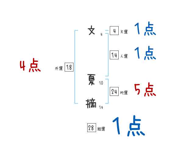 総運![]() | 文夏摘さんの総運は28画の1つ星!家庭環境に注意。スポーツで活躍できる能力があるかも。 あなたの人生を表す1番重要な運勢です。生涯を通じて影響する総合運となり、主に50歳以降の晩年期に影響を及ぼします。 |