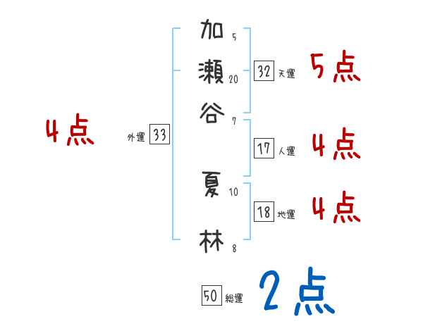 天運![]() | 加瀬谷夏林さんの天運は32画の5つ星!柔軟性があり成功する。チャンスが多く金運が良い。 家系が持つ宿命的な運勢を表します。祖先から受け継いだ苗字ですので自分の力が及びません。家柄を象徴します。 |