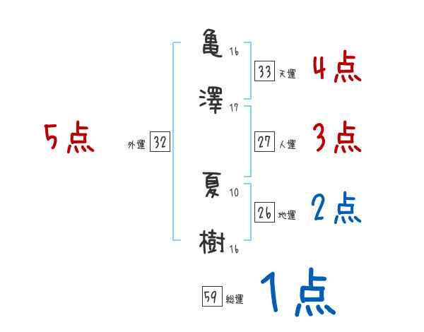 外運![]() | 亀澤夏樹さんの外運は32画の5つ星!柔軟性があり成功する。チャンスが多く金運が良い。 生活面を象徴する運勢です。外部から受ける影響力を表し、結婚運、家庭運や職場、環境への順応性を表します。 |