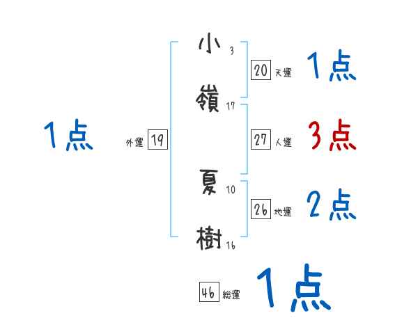 地運![]() | 小嶺夏樹さんの地運は26画の2つ星!波瀾万丈かも。信頼できる人を大事にしましょう。 個性を表す基礎的な運勢です。性格形成や対人関係、行動力など家庭環境に影響されます。主に誕生してから20歳くらいまでの若年期の運勢を表します。 |