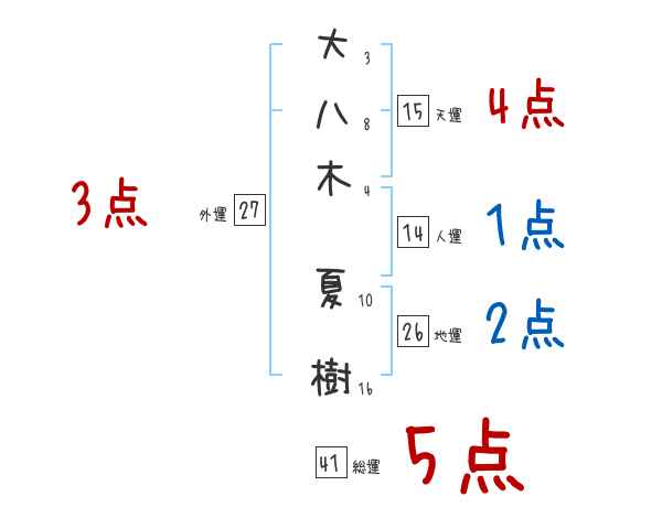 外運![]() | 大八木夏樹さんの外運は27画の3つ星!頭脳明晰だが強情で摩擦が多い傾向。孤立に注意。 生活面を象徴する運勢です。外部から受ける影響力を表し、結婚運、家庭運や職場、環境への順応性を表します。 |