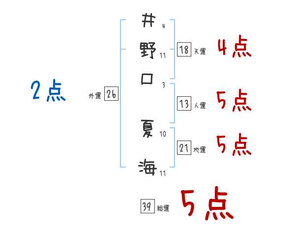 総運![]() | 井野口夏海さんの総運は39画の5つ星!社交性に優れ人望が厚い。人の上に立ち成功する。 あなたの人生を表す1番重要な運勢です。生涯を通じて影響する総合運となり、主に50歳以降の晩年期に影響を及ぼします。 |