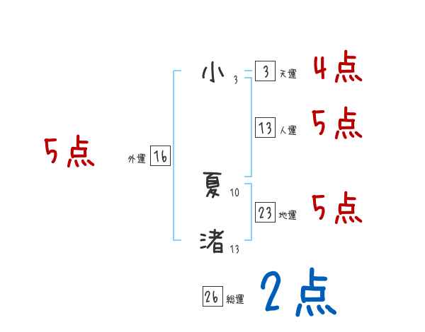 天運![]() | 小夏渚さんの天運は3画の4つ星!活動的で才能に恵まれ、多くの信頼を得る。希望に満ち成長する。 家系が持つ宿命的な運勢を表します。祖先から受け継いだ苗字ですので自分の力が及びません。家柄を象徴します。 |