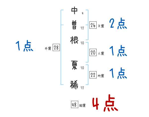 外運![]() | 中曽根夏稀さんの外運は28画の1つ星!家庭環境に注意。スポーツで活躍できる能力があるかも。 生活面を象徴する運勢です。外部から受ける影響力を表し、結婚運、家庭運や職場、環境への順応性を表します。 |