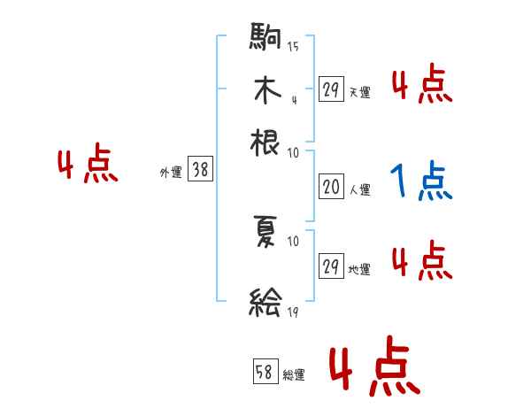 総運![]() | 駒木根夏絵さんの総運は58画の4つ星!安定した生活。大器晩成タイプ。 あなたの人生を表す1番重要な運勢です。生涯を通じて影響する総合運となり、主に50歳以降の晩年期に影響を及ぼします。 |