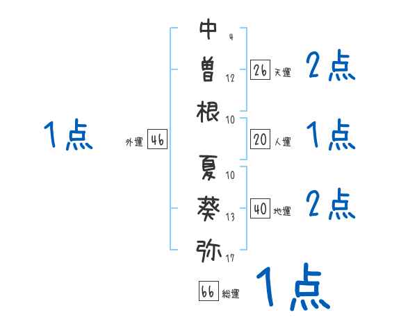 外運![]() | 中曽根夏葵弥さんの外運は46画の1つ星!迷走することが多く苦労するかも。目先のことにとらわれないように。 生活面を象徴する運勢です。外部から受ける影響力を表し、結婚運、家庭運や職場、環境への順応性を表します。 |