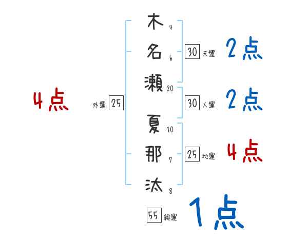 天運![]() | 木名瀬夏那汰さんの天運は30画の2つ星!浮き沈みの激しさに注意しましょう。 家系が持つ宿命的な運勢を表します。祖先から受け継いだ苗字ですので自分の力が及びません。家柄を象徴します。 |