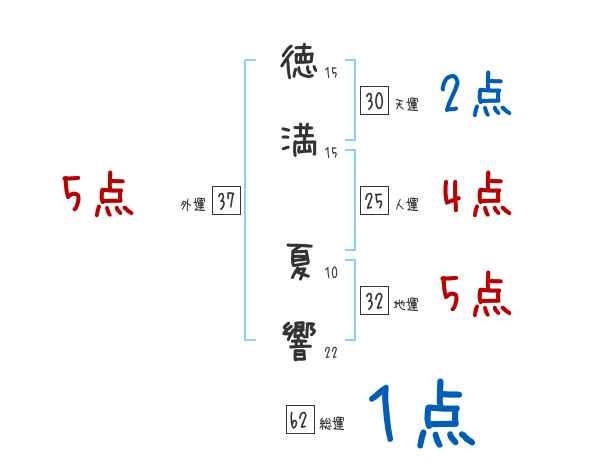 天運![]() | 徳満夏響さんの天運は30画の2つ星!浮き沈みの激しさに注意しましょう。 家系が持つ宿命的な運勢を表します。祖先から受け継いだ苗字ですので自分の力が及びません。家柄を象徴します。 |