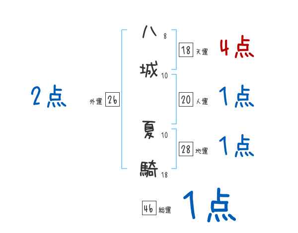 天運![]() | 八城夏騎さんの天運は18画の4つ星!情熱的で剛気。忍耐力があり信頼される。 家系が持つ宿命的な運勢を表します。祖先から受け継いだ苗字ですので自分の力が及びません。家柄を象徴します。 |