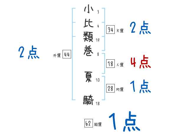 外運![]() | 小比類巻夏騎さんの外運は44画の2つ星!誠実で慎重な性格。物事を考えすぎないように注意しましょう。 生活面を象徴する運勢です。外部から受ける影響力を表し、結婚運、家庭運や職場、環境への順応性を表します。 |