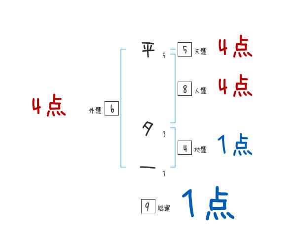 天運![]() | 平夕一さんの天運は5画の4つ星!健康で安泰。協調性に優れ、財産に恵まれる。 家系が持つ宿命的な運勢を表します。祖先から受け継いだ苗字ですので自分の力が及びません。家柄を象徴します。 |