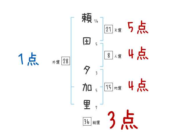天運![]() | 頼田夕加里さんの天運は21画の5つ星!統率力がある。独立し成功する。名誉を手に入れる。 家系が持つ宿命的な運勢を表します。祖先から受け継いだ苗字ですので自分の力が及びません。家柄を象徴します。 |