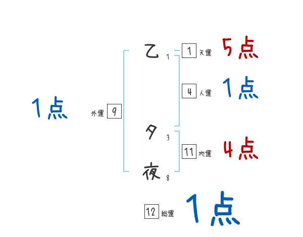天運![]() | 乙夕夜さんの天運は1画の5つ星!行動力、指導力があり出世し繁栄する。幸運に恵まれる。 家系が持つ宿命的な運勢を表します。祖先から受け継いだ苗字ですので自分の力が及びません。家柄を象徴します。 |