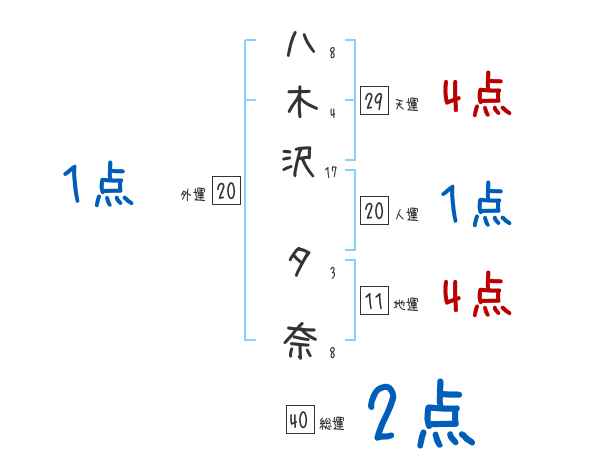 天運![]() | 八木沢夕奈さんの天運は29画の4つ星!完全主義で才能がある。厳格な心の持ち主。 家系が持つ宿命的な運勢を表します。祖先から受け継いだ苗字ですので自分の力が及びません。家柄を象徴します。 |