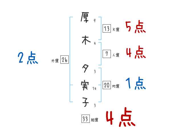 天運![]() | 厚木夕実子さんの天運は13画の5つ星!才能に恵まれ人気がある。名声を手に入れる。円満な人生。 家系が持つ宿命的な運勢を表します。祖先から受け継いだ苗字ですので自分の力が及びません。家柄を象徴します。 |