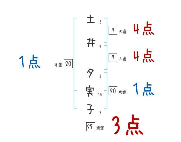 人運![]() | 土井夕実子さんの人運は7画の4つ星!強い意志や信念を持ち独立心が強い。自立する。 性格や才能などを表す2番目に重要な運勢です。人間関係や協調性、社会的な成功に影響します。主に20歳から50歳ぐらいまでの中年期の運勢を表します。 |