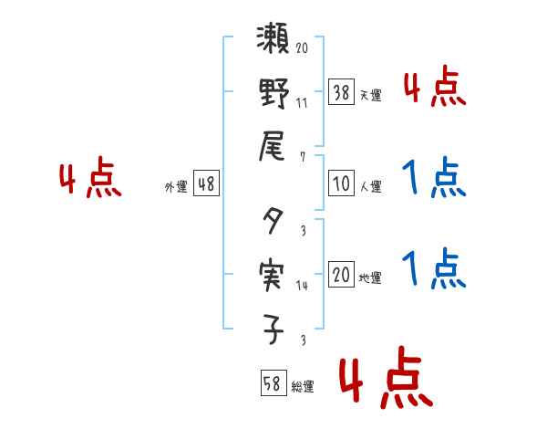 総運![]() | 瀬野尾夕実子さんの総運は58画の4つ星!安定した生活。大器晩成タイプ。 あなたの人生を表す1番重要な運勢です。生涯を通じて影響する総合運となり、主に50歳以降の晩年期に影響を及ぼします。 |
