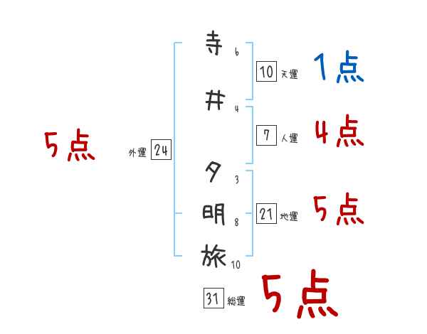 外運![]() | 寺井夕明旅さんの外運は24画の5つ星!家庭運が良く順調な人生。金運にも恵まれる。 生活面を象徴する運勢です。外部から受ける影響力を表し、結婚運、家庭運や職場、環境への順応性を表します。 |