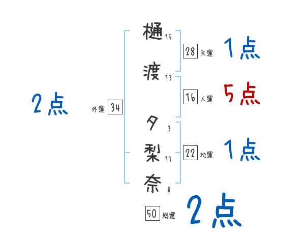 人運![]() | 樋渡夕梨奈さんの人運は16画の5つ星!人望が厚く大きく発展する。逆転成功が見える。 性格や才能などを表す2番目に重要な運勢です。人間関係や協調性、社会的な成功に影響します。主に20歳から50歳ぐらいまでの中年期の運勢を表します。 |
