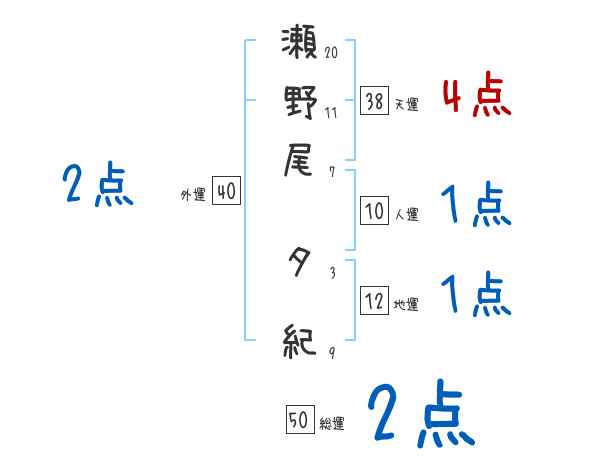 総運![]() | 瀬野尾夕紀さんの総運は50画の2つ星!浮き沈みが激しく不安定。しりすぼみに衰退しやすいので注意しましょう。 あなたの人生を表す1番重要な運勢です。生涯を通じて影響する総合運となり、主に50歳以降の晩年期に影響を及ぼします。 |