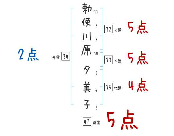 天運![]() | 勅使川原夕美子さんの天運は32画の5つ星!柔軟性があり成功する。チャンスが多く金運が良い。 家系が持つ宿命的な運勢を表します。祖先から受け継いだ苗字ですので自分の力が及びません。家柄を象徴します。 |