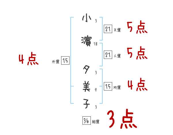 外運![]() | 小濵夕美子さんの外運は15画の4つ星!人徳があり出世する。順調に物事を進め円満な人生。 生活面を象徴する運勢です。外部から受ける影響力を表し、結婚運、家庭運や職場、環境への順応性を表します。 |