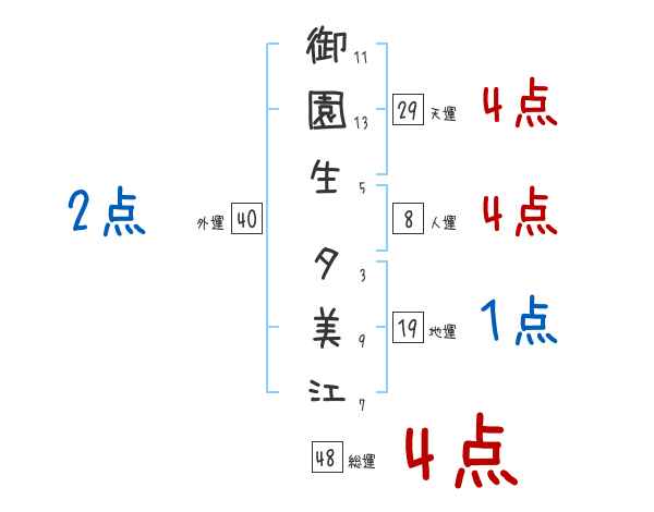 天運![]() | 御園生夕美江さんの天運は29画の4つ星!完全主義で才能がある。厳格な心の持ち主。 家系が持つ宿命的な運勢を表します。祖先から受け継いだ苗字ですので自分の力が及びません。家柄を象徴します。 |