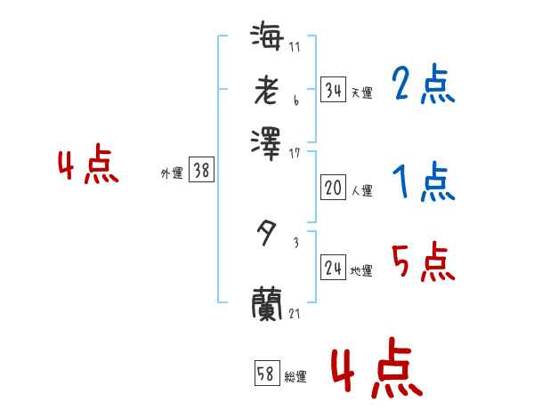 総運![]() | 海老澤夕蘭さんの総運は58画の4つ星!安定した生活。大器晩成タイプ。 あなたの人生を表す1番重要な運勢です。生涯を通じて影響する総合運となり、主に50歳以降の晩年期に影響を及ぼします。 |