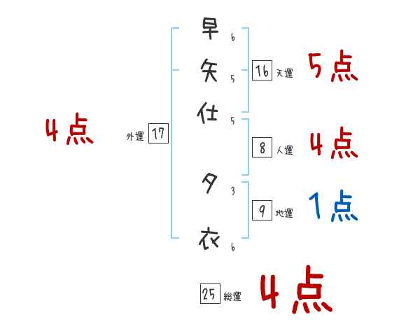 天運![]() | 早矢仕夕衣さんの天運は16画の5つ星!人望が厚く大きく発展する。逆転成功が見える。 家系が持つ宿命的な運勢を表します。祖先から受け継いだ苗字ですので自分の力が及びません。家柄を象徴します。 |