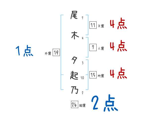 人運![]() | 尾木夕起乃さんの人運は7画の4つ星!強い意志や信念を持ち独立心が強い。自立する。 性格や才能などを表す2番目に重要な運勢です。人間関係や協調性、社会的な成功に影響します。主に20歳から50歳ぐらいまでの中年期の運勢を表します。 |