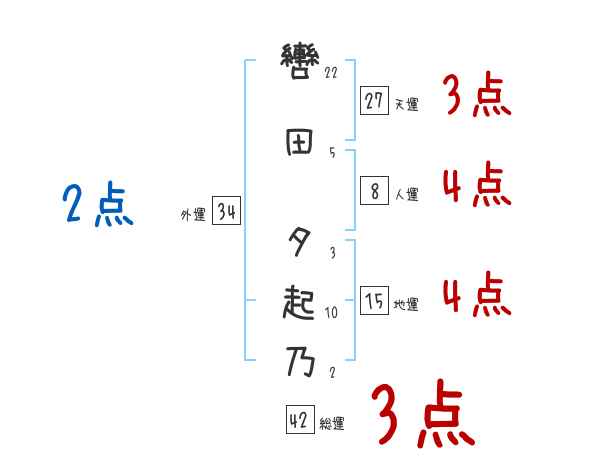 総運![]() | 轡田夕起乃さんの総運は42画の3つ星!病気に注意。多芸であるが消極的でおとなしい。 あなたの人生を表す1番重要な運勢です。生涯を通じて影響する総合運となり、主に50歳以降の晩年期に影響を及ぼします。 |