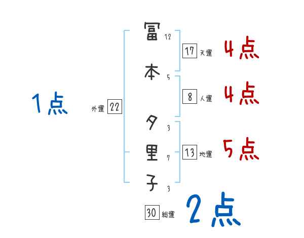 天運![]() | 冨本夕里子さんの天運は17画の4つ星!積極的な行動力。地位を気づき財産を手に入れる。純粋な心と直感力。 家系が持つ宿命的な運勢を表します。祖先から受け継いだ苗字ですので自分の力が及びません。家柄を象徴します。 |