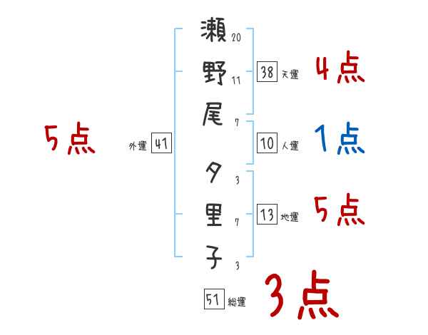 総運![]() | 瀬野尾夕里子さんの総運は51画の3つ星!変化が激しく、危険に注意。堅実な性格。 あなたの人生を表す1番重要な運勢です。生涯を通じて影響する総合運となり、主に50歳以降の晩年期に影響を及ぼします。 |