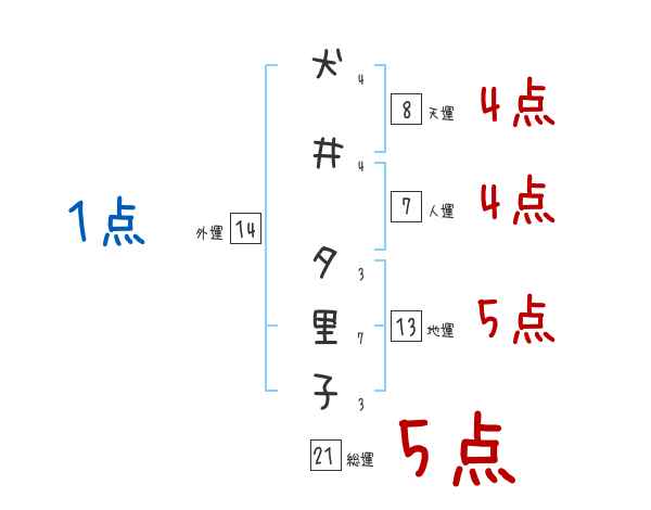 天運![]() | 犬井夕里子さんの天運は8画の4つ星!勤勉家。根気強く努力し成功する。忍耐力がある。 家系が持つ宿命的な運勢を表します。祖先から受け継いだ苗字ですので自分の力が及びません。家柄を象徴します。 |