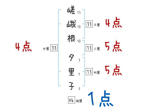 外運![]() | 嵯峨根夕里子さんの外運は33画の4つ星!権力志向でプライドが高い。勇気があり運を切り開き成功する。 生活面を象徴する運勢です。外部から受ける影響力を表し、結婚運、家庭運や職場、環境への順応性を表します。 |