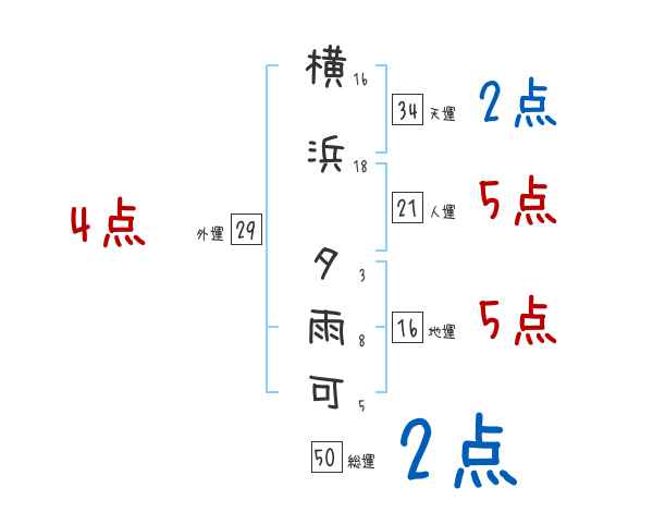 人運![]() | 横浜夕雨可さんの人運は21画の5つ星!統率力がある。独立し成功する。名誉を手に入れる。 性格や才能などを表す2番目に重要な運勢です。人間関係や協調性、社会的な成功に影響します。主に20歳から50歳ぐらいまでの中年期の運勢を表します。 |