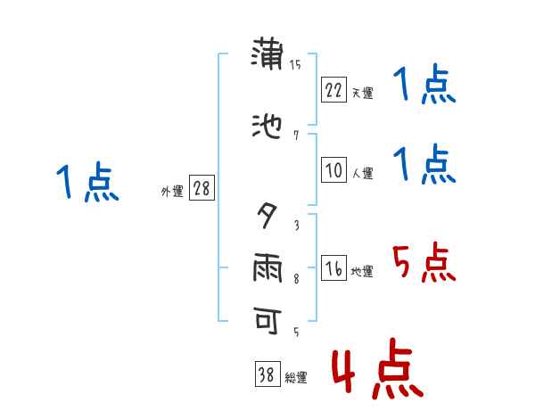 天運![]() | 蒲池夕雨可さんの天運は22画の1つ星!努力することが苦手ないっぽう手先が器用。芸術性にも優れる。 家系が持つ宿命的な運勢を表します。祖先から受け継いだ苗字ですので自分の力が及びません。家柄を象徴します。 |