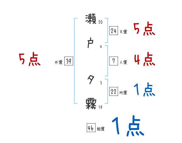 天運![]() | 瀬戸夕霧さんの天運は24画の5つ星!家庭運が良く順調な人生。金運にも恵まれる。 家系が持つ宿命的な運勢を表します。祖先から受け継いだ苗字ですので自分の力が及びません。家柄を象徴します。 |