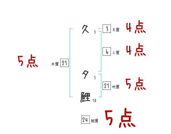総運![]() | 久夕鯉さんの総運は24画の5つ星!家庭運が良く順調な人生。金運にも恵まれる。 あなたの人生を表す1番重要な運勢です。生涯を通じて影響する総合運となり、主に50歳以降の晩年期に影響を及ぼします。 |