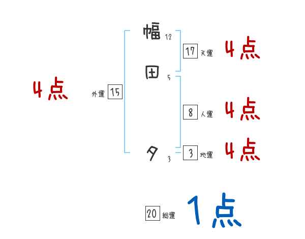 天運![]() | 幅田夕さんの天運は17画の4つ星!積極的な行動力。地位を気づき財産を手に入れる。純粋な心と直感力。 家系が持つ宿命的な運勢を表します。祖先から受け継いだ苗字ですので自分の力が及びません。家柄を象徴します。 |