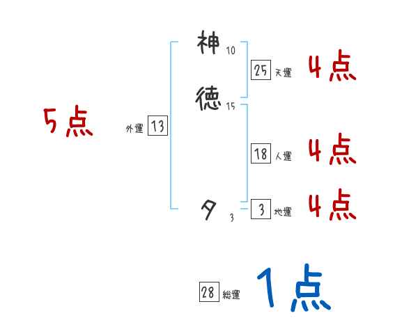 総運![]() | 神徳夕さんの総運は28画の1つ星!家庭環境に注意。スポーツで活躍できる能力があるかも。 あなたの人生を表す1番重要な運勢です。生涯を通じて影響する総合運となり、主に50歳以降の晩年期に影響を及ぼします。 |