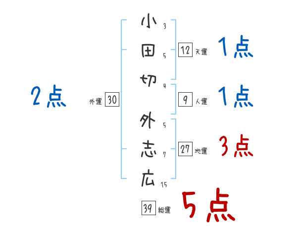 総運![]() | 小田切外志広さんの総運は39画の5つ星!社交性に優れ人望が厚い。人の上に立ち成功する。 あなたの人生を表す1番重要な運勢です。生涯を通じて影響する総合運となり、主に50歳以降の晩年期に影響を及ぼします。 |