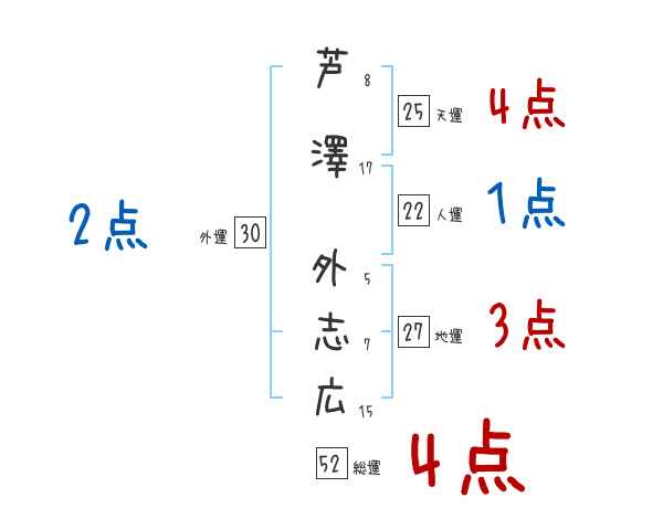 外運![]() | 芦澤外志広さんの外運は30画の2つ星!浮き沈みの激しさに注意しましょう。 生活面を象徴する運勢です。外部から受ける影響力を表し、結婚運、家庭運や職場、環境への順応性を表します。 |