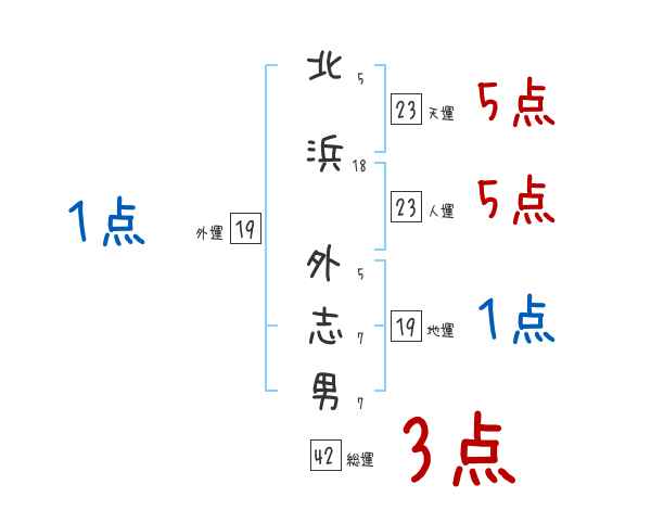 外運![]() | 北浜外志男さんの外運は19画の1つ星!優れた才能を持ちますが、協調性が足りないことも。周りの人と協力する事を意識しましょう。 生活面を象徴する運勢です。外部から受ける影響力を表し、結婚運、家庭運や職場、環境への順応性を表します。 |