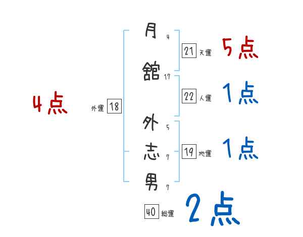外運![]() | 月舘外志男さんの外運は18画の4つ星!情熱的で剛気。忍耐力があり信頼される。 生活面を象徴する運勢です。外部から受ける影響力を表し、結婚運、家庭運や職場、環境への順応性を表します。 |