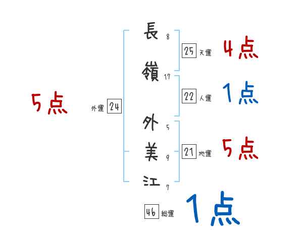 外運![]() | 長嶺外美江さんの外運は24画の5つ星!家庭運が良く順調な人生。金運にも恵まれる。 生活面を象徴する運勢です。外部から受ける影響力を表し、結婚運、家庭運や職場、環境への順応性を表します。 |